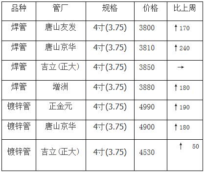 監(jiān)測數(shù)據(jù)顯示,截至8月7日,天津友發(fā)產(chǎn)4寸(3.75)新國標直縫焊接鋼管現(xiàn)金出廠價格為3800元,比上周同期上調(diào)170元;天津 京華產(chǎn)4寸(3.75)新國標直縫焊接鋼管現(xiàn)金出廠價格為3810元,比上周同期上調(diào)240元;吉立(正大)產(chǎn)4寸(3.75)新國標直縫焊接鋼管現(xiàn)金出廠價格為3850 元,與上周持平。